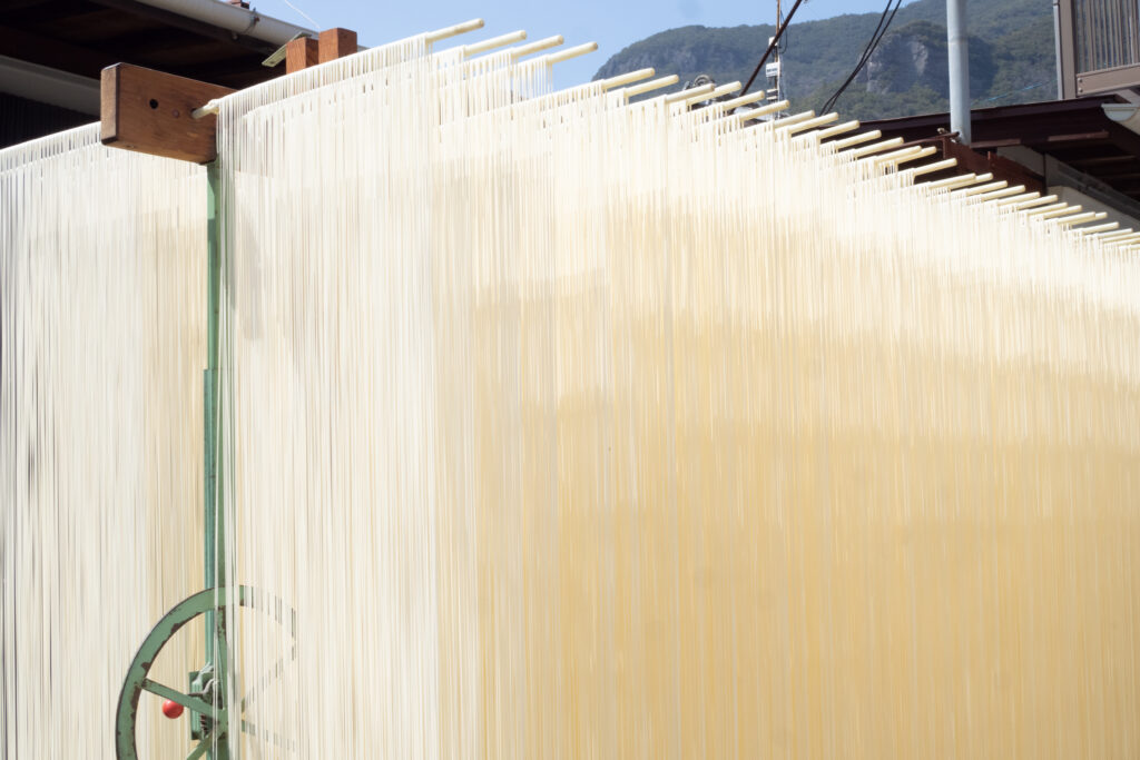 私たちは「はた」と呼ばれる干し場に麺を広げる際、その日の風向きに合わせて麺の間隔を調整します。 白く長い麺が、風になびいてサラサラと布擦れのような音を立てる時。この音が軽やかであればあるほど、喉越しの良いそうめんになります。