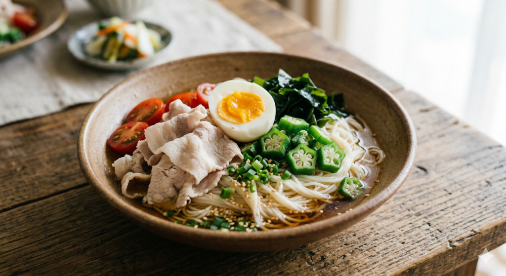 例えば、豚しゃぶやゆで卵で良質なタンパク質を加え、オクラやトマト、ワカメなどの食物繊維をたっぷりと乗せる「ごちそうぶっかけそうめん」はいかがでしょうか。彩りが美しいだけでなく、具材を噛むことで自然と食事のペースがゆっくりになり、2束でも十分な満足感が得られます。