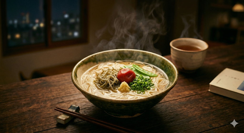 A. はい、温かい「にゅうめん」であればおすすめです。そうめんは消化が良い食べ物ですので、胃腸への負担が少なく済みます。ただし、夜遅い時間は天ぷらなど脂質の多いトッピングは避け、梅干しやとろろ昆布など、あっさりとした具材でお召し上がりください。